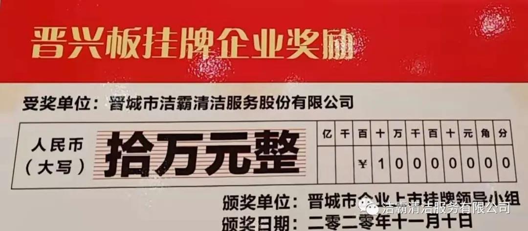晉城市潔霸清潔服務(wù)股份有限公司于2019年11月27日成功登陸山西股權(quán)交易中心“專精特新板”(晉興板)(企業(yè)代碼:060200Z),是“專精特新板”開板暨首批掛牌的14家企業(yè)之一!皩>匦掳濉笔巧轿鞴蓹(quán)交易中心設(shè)立的特色板塊,為省內(nèi)具備專業(yè)化、精細化、特色化、新穎化的優(yōu)質(zhì)企業(yè)提供專屬服務(wù),成為帶動全省中小企業(yè)創(chuàng)新創(chuàng)造、轉(zhuǎn)型升級,壯大工業(yè)高質(zhì)量發(fā)展的生力軍!皶x興板”掛牌,標志著公司正式進軍資本市場,豐富了融資渠道,推動公司高質(zhì)量轉(zhuǎn)型發(fā)展,成為公司發(fā)展的新引擎。