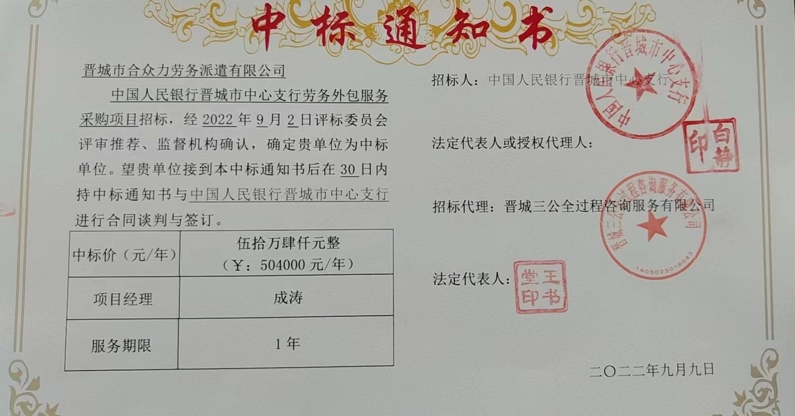 近日,晉城市合眾力勞務(wù)派遣有限公司收到《中標(biāo)通知書》,確定公司為中國人民銀行晉城市中心支行勞務(wù)外包服務(wù)采購項(xiàng)目的中標(biāo)人,中標(biāo)金額504000元。