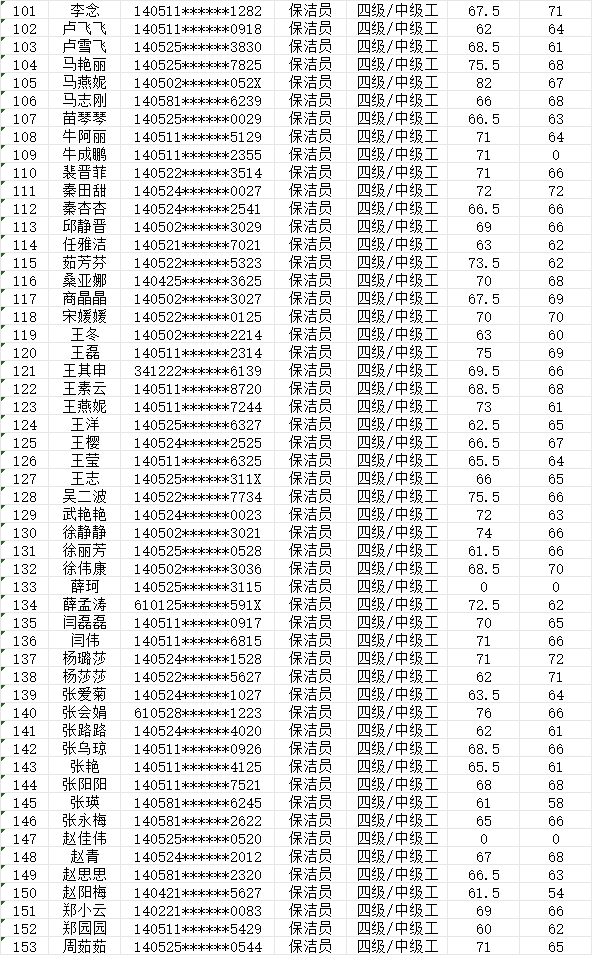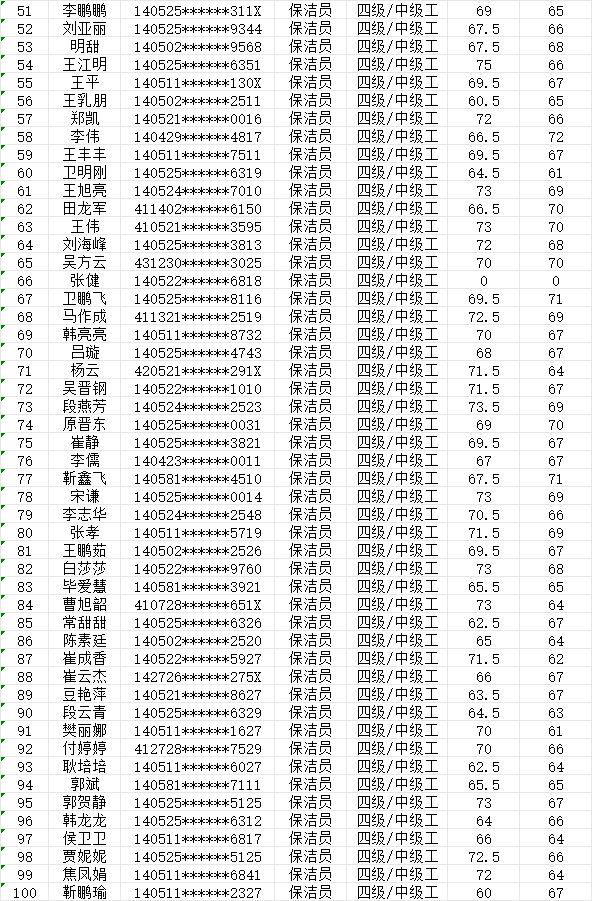 晉城市潔霸清潔服務(wù)股份有限公司職業(yè)技能等級認(rèn)定中心現(xiàn)將2024128日認(rèn)定人員成績公示如下: