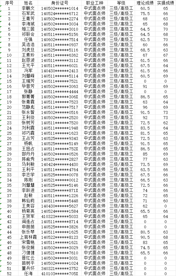 晉城市潔霸清潔服務(wù)股份有限公司職業(yè)技能等級(jí)認(rèn)定中心2024年6月29日第4批中式面點(diǎn)師高級(jí)認(rèn)定人員成績(jī)公示