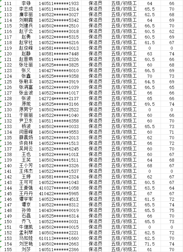 晉城市潔霸清潔服務(wù)股份有限公司職業(yè)技能等級認(rèn)定中心現(xiàn)將2024年7月27日認(rèn)定人員成績公示如下: