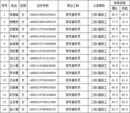 山西潔霸清潔服務(wù)集團(tuán)股份有限公司職業(yè)技能等級認(rèn)定中心2025年9月13日第2批家政服務(wù)員(家務(wù)服務(wù)員)高級認(rèn)定人員成績公示