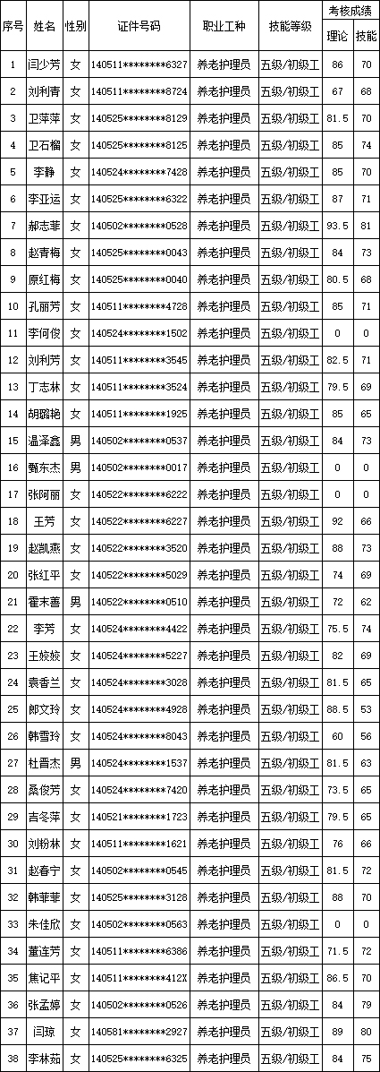 山西潔霸清潔服務集團股份有限公司職業(yè)技能等級認定中心2025年11月9日第2批養(yǎng)老護理員初級認定人員成績公示